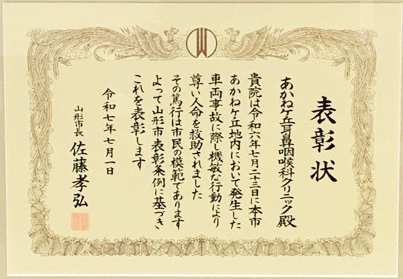 この度、当院は山形市から篤行表彰をいただきました。これからも地域の皆様のために精一杯努めてまいりますので、引き続きどうぞよろしくお願いいたします。